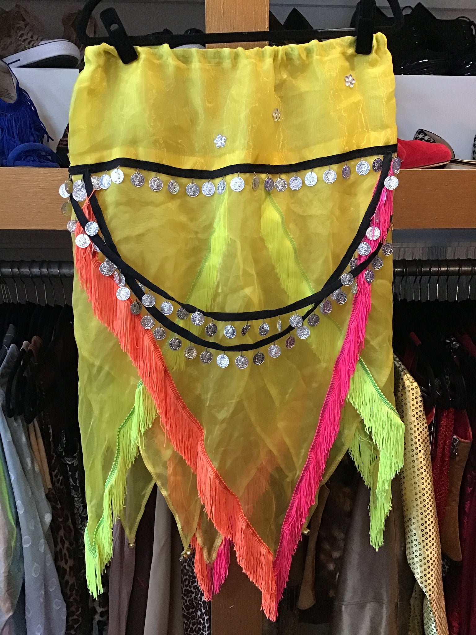 One handmade layered neon skirt. This skirt has rainbow neon fringe that borders the bright yellow panels that make up this piece. Silver coins hang from this skirt and golden bells are sewn at the bottom of the yellow panels. jingle wherever you go. There is a string on the side that can adjust the size.